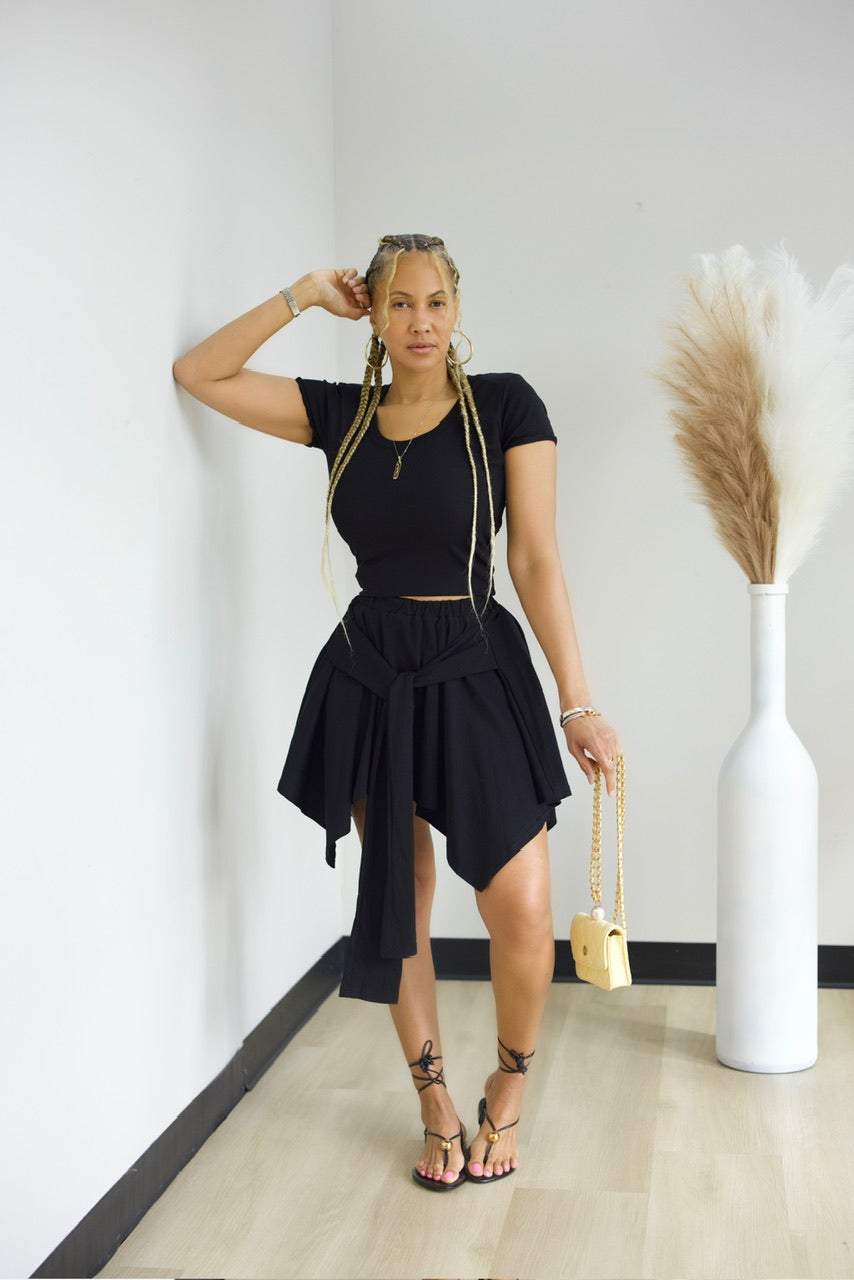 This two-piece skirt set combines comfort with effortless style. The pullover top pairs with an elastic-waist skirt featuring an eye-catching uneven hemline and front tie detail.