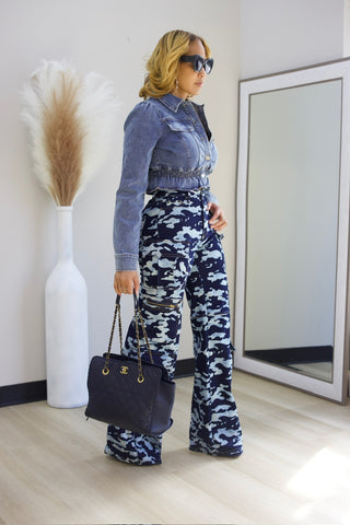 These camouflage blue cargo jeans combine practical design with a modern edge. Featuring a zipper front and secure zipper cargo pockets, they offer convenient storage while maintaining a sleek look. The straight-leg cut provides a flattering fit, and minimal stretch ensures durability and structure for everyday wear.