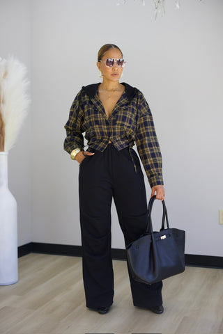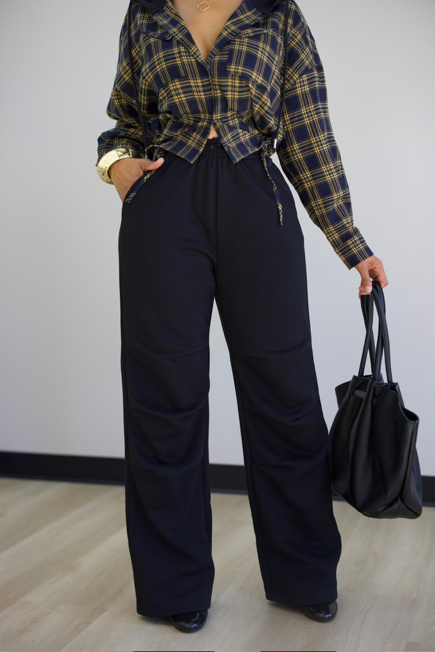 These black sweatpants combine comfort and style with their elastic waistband and side pockets for easy storage. The ruched knees add a trendy, flattering touch, making them perfect for everyday wear or casual outings. Designed for a relaxed yet polished look, these sweatpants offer both functionality and fashion for your wardrobe.