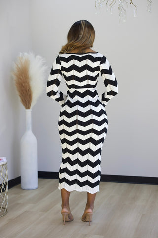 Elevate your wardrobe with this striking black and white chevron stripe maxi dress. The fitted knit construction hugs your curves while the stretchy fabric ensures all-day comfort and ease of movement. A chic front keyhole opening adds a touch of sophistication and visual interest to this versatile piece. Perfect for everything from casual outings to evening events, this dress transitions seamlessly from day to night.