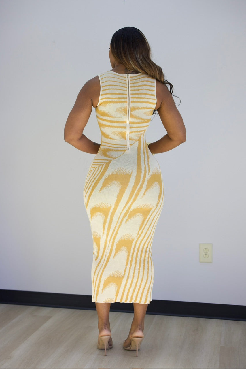 Effortless elegance meets comfort in this sleeveless knit midi dress. Featuring an all-over swirl pattern, the fitted silhouette hugs your curves while the stretchy fabric moves with you throughout the day.