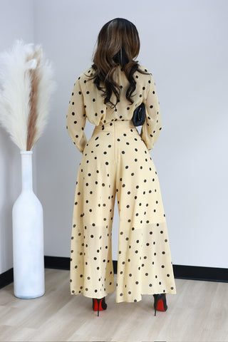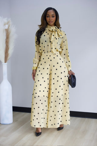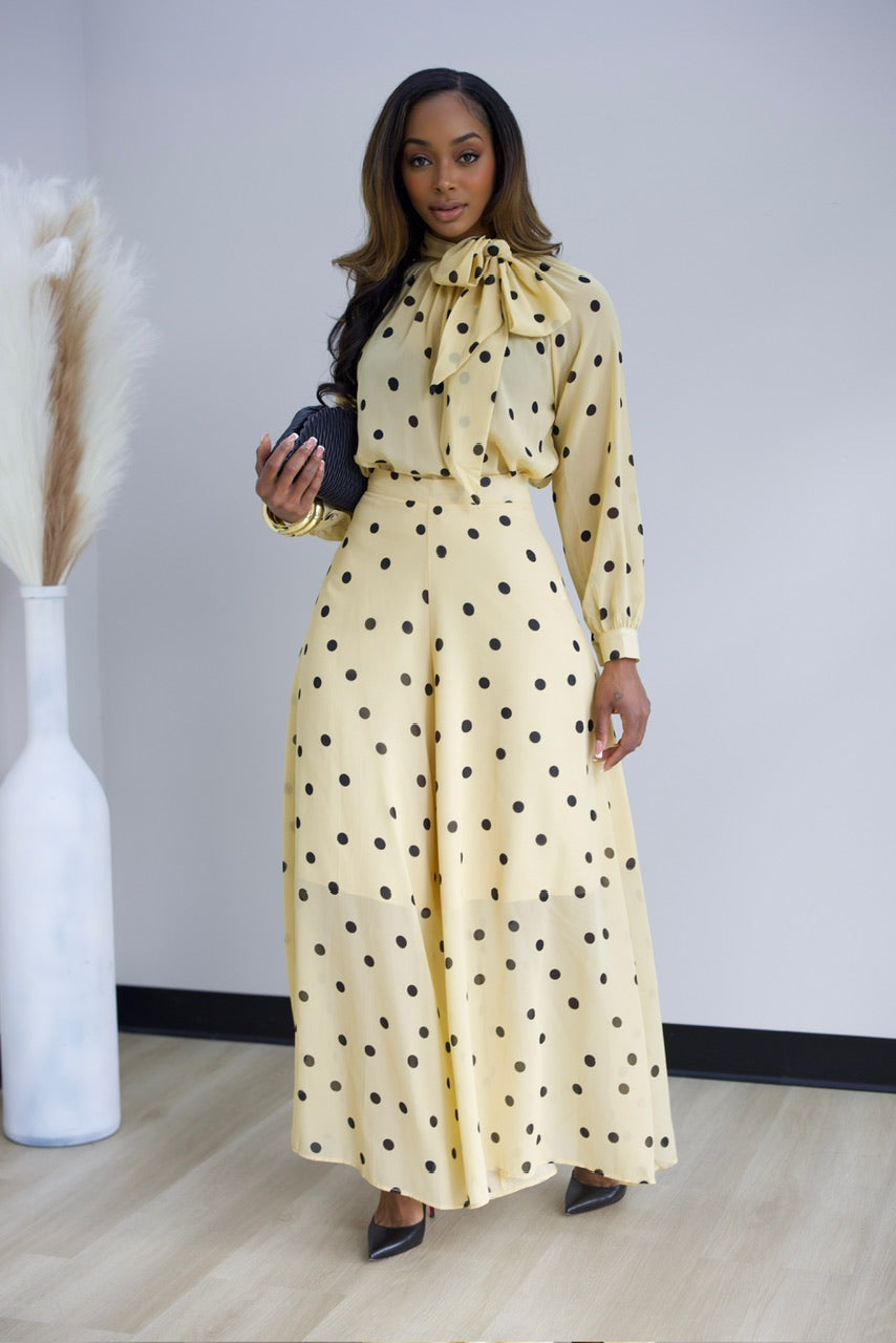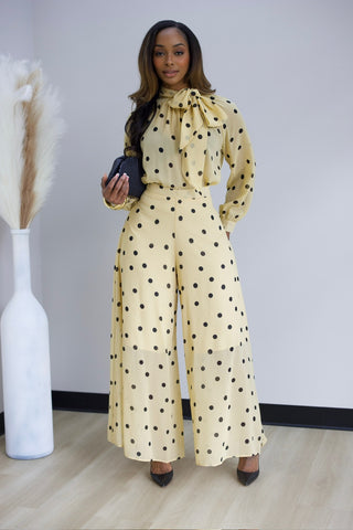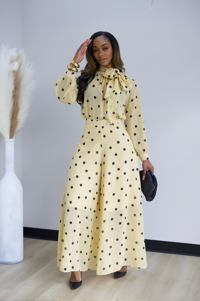 Elevate your wardrobe with this chic polka dot two-piece set. The high-waisted wide-leg pants feature a flattering palazzo silhouette with a convenient back zipper and half lining for comfort. Pair them with the coordinating pullover blouse, complete with an eye-catching oversized bow detail. Crafted from non-stretch fabric for a structured, polished look that holds its shape beautifully throughout the day.
