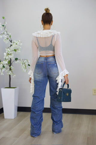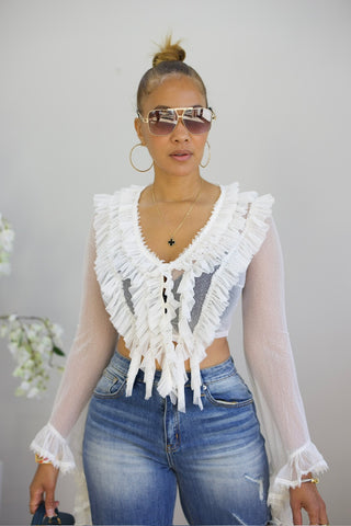 Elevate your wardrobe with this charming button-front crop shirt, designed for a polished yet playful look. Delicate ruffles cascade down the front and sleeves, adding romantic texture and movement. The fitted stretch bodice hugs your curves beautifully, offering comfort and a flattering silhouette that works for both casual outings and dressed-up occasions.