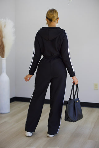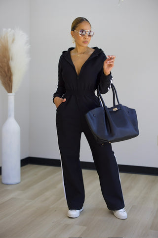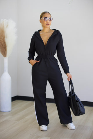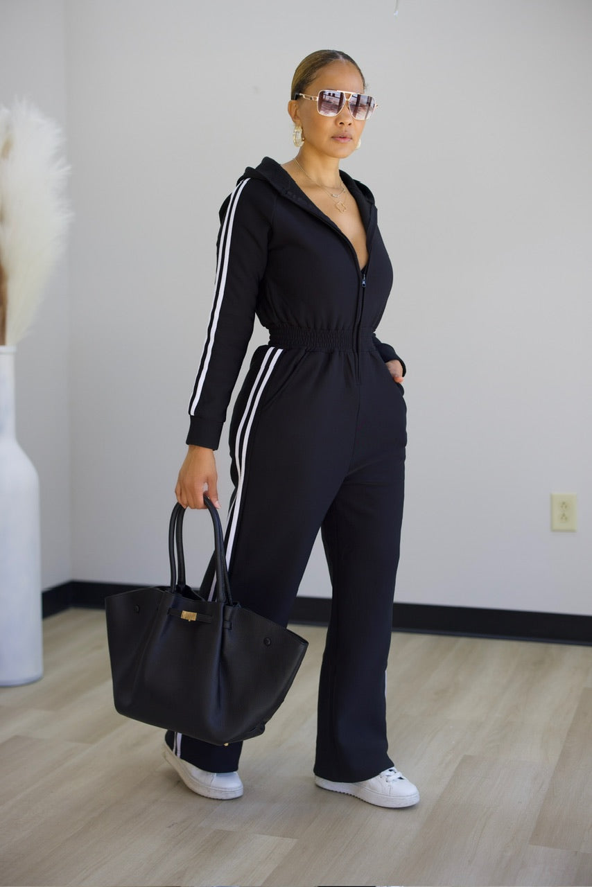 This one-piece jumper blends comfort and style effortlessly. Featuring a front zipper and elastic waistband, it ensures a flattering fit and easy wear. The hooded top adds a cozy touch, while the side stripe offers a subtle sporty accent. Made from thick, warm, and stretchy fabric, it’s perfect for chilly days when you want to stay comfortable without sacrificing style.