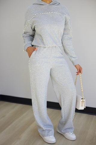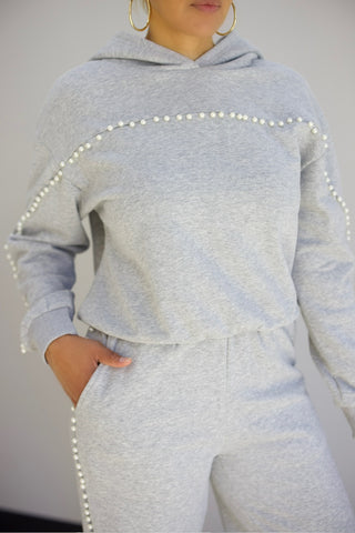 This cozy two-piece sweatsuit features a soft pullover hoodie with elegant pearl piping details throughout for a subtle touch of sophistication. The elastic waistband ensures a comfortable fit, while side pockets add convenience. Designed with a generous fit, it offers both style and ease, perfect for relaxed days or casual outings.