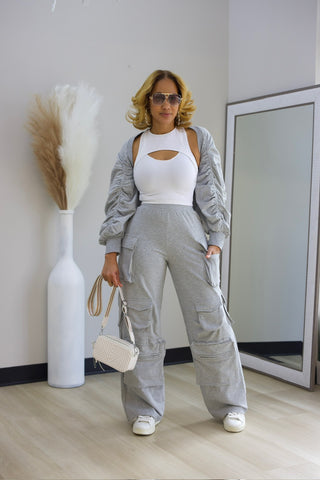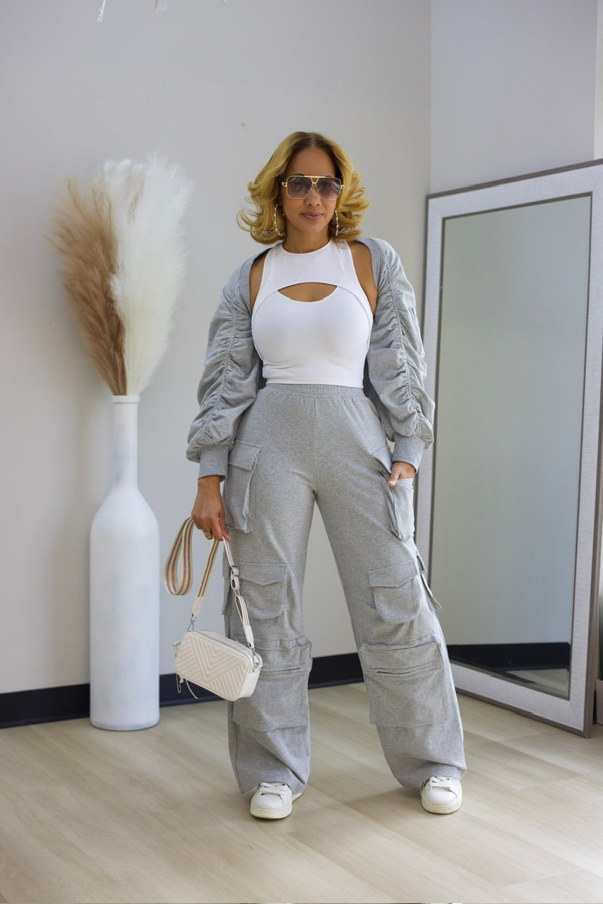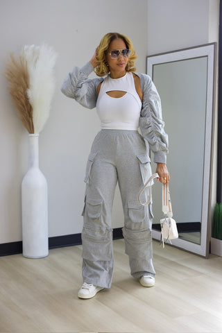 Elevate your casual wardrobe with this versatile 2-piece cargo set. The relaxed-fit sweatpants feature a comfortable elastic stretch waist and functional cargo pockets, while the oversized shrug top layers effortlessly over any outfit. Perfect for weekend errands, travel, or cozy days at home, this set combines comfort with contemporary style.