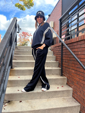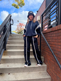 This 2pc jogger set includes a pullover hooded top and elastic stretch waist pants, all with a white pinstripe trim detail. Experience an oversized fit for maximum comfort and style. Perfect for lounging or casual outings.