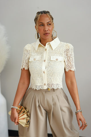 Elevate your wardrobe with this elegant lace button-front shirt featuring delicate pearl buttons and a charming scalloped hemline. The structured, non-stretch fabric provides a polished silhouette perfect for both professional settings and special occasions. The intricate lace detailing adds feminine sophistication, while the classic button closure ensures easy styling versatility. A timeless piece that transitions seamlessly from day to evening wear.