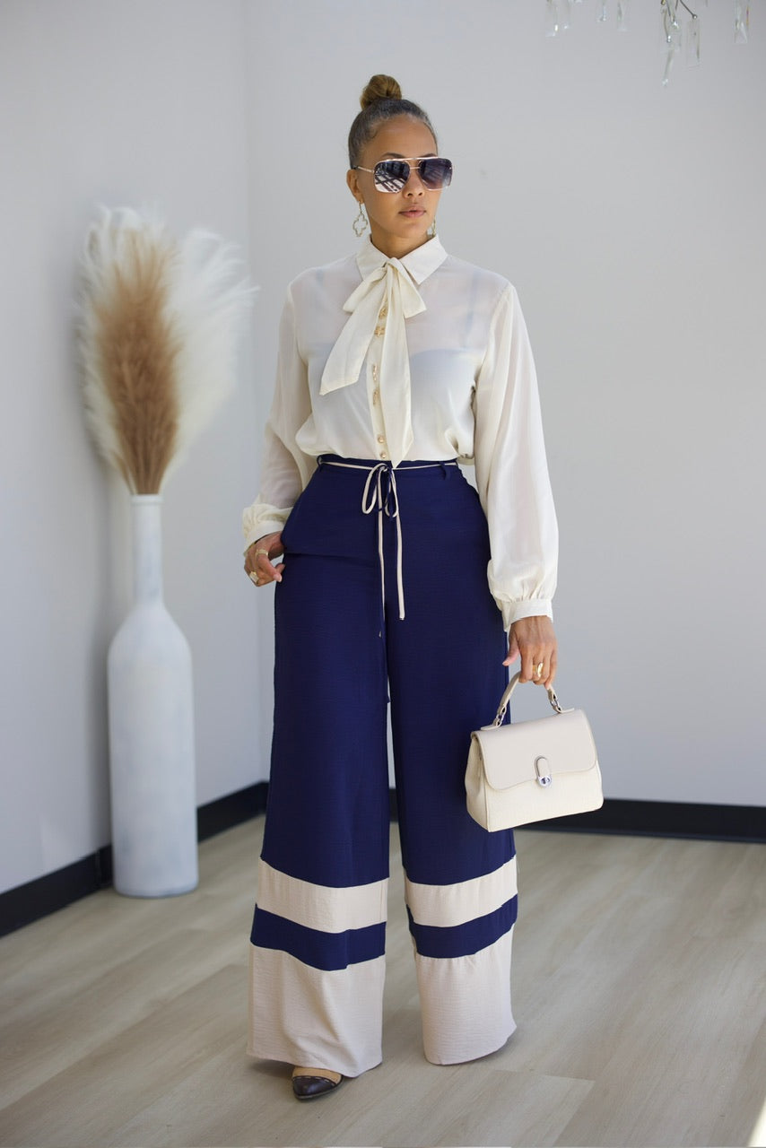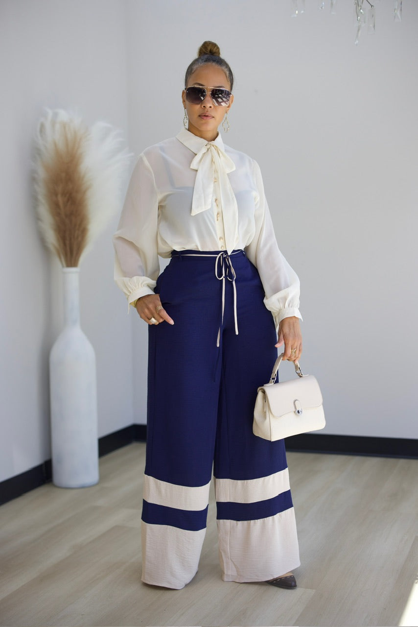 This semi-sheer blouse features elegant gold-embellished buttons and an attached neck bow tie for a chic, feminine touch. Designed with a roomy fit, it offers both comfort and style, perfect for dressing up or down throughout your day.