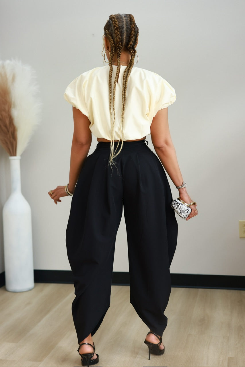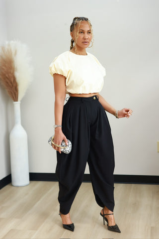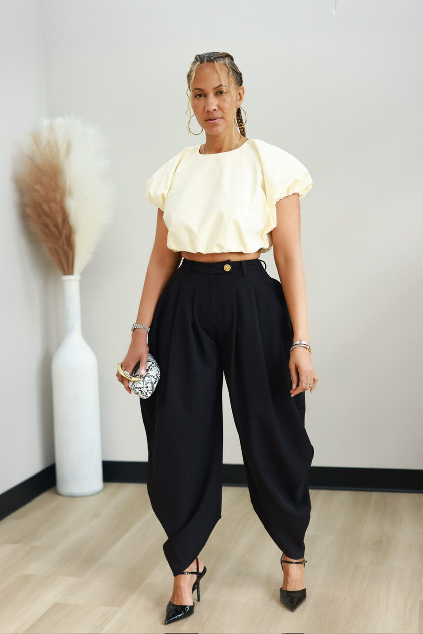 Elevate your wardrobe with this charming crop puff blouse, designed to make a statement. The voluminous balloon hemline creates a playful silhouette that flatters and flows beautifully. Featuring a convenient back button closure, this piece offers both style and ease.