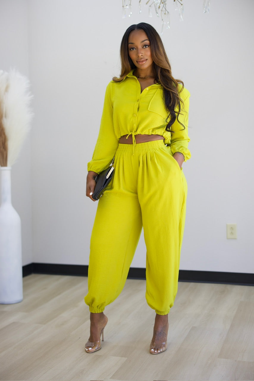 This two-piece pant set offers effortless style and comfort with a button-front top and pull-on jogger bottoms. The drawstring waist ensures a customizable fit, while side pockets add practicality. Finished with elastic closures at the ankles, these joggers provide a relaxed yet flattering silhouette perfect for everyday wear.