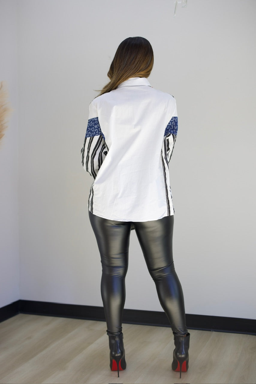 Effortless style meets everyday comfort in this versatile button-front shirt. Crafted from soft cotton, it features eye-catching striped sleeves that add visual interest to your wardrobe. The relaxed fit works for most body types, making it a go-to piece for casual outings, weekend errands, or layering under your favorite sweater. Pair it with jeans, trousers, or a skirt for endless styling possibilities.