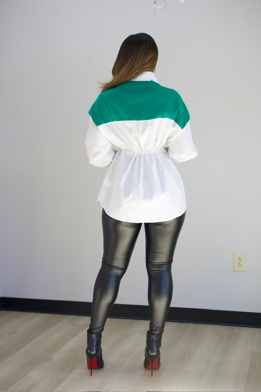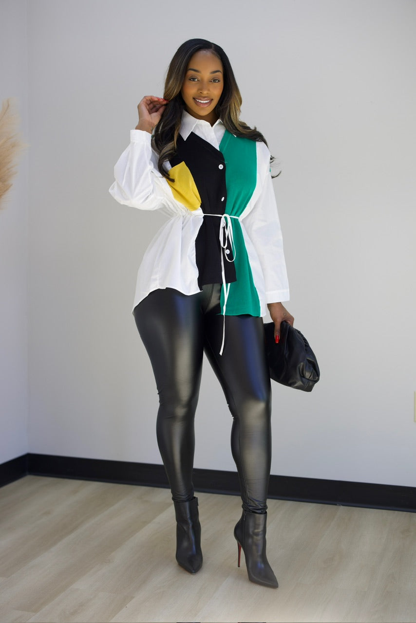 Effortless style meets modern design in this button-front shirt featuring a striking colorblock patchwork pattern. The drawstring waist creates a flattering silhouette you can adjust to your preference, while the relaxed fit offers all-day comfort. Perfect for layering or wearing solo, this versatile piece transitions seamlessly from casual weekends to creative work settings. The mixed-color blocking adds visual interest to any wardrobe, making it an easy go-to for putting together polished, put-together looks.