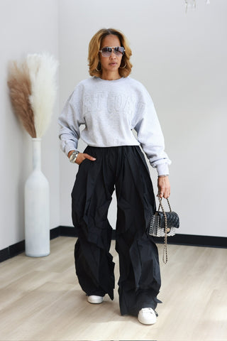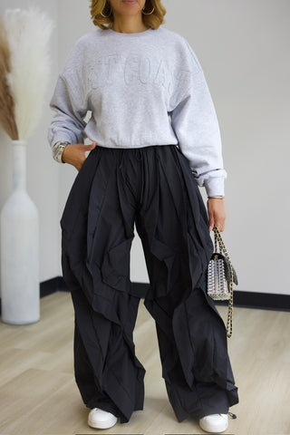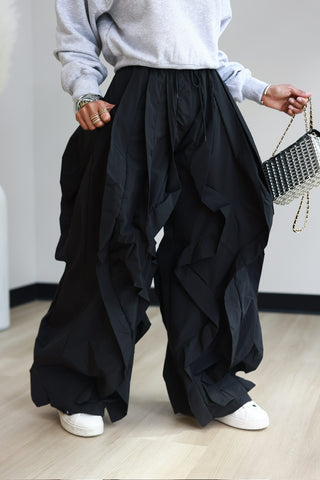 These Truffle Pants in black feature all-over ruffles for a playful, textured look. Designed with a drawstring waist and adjustable drawstring bottoms, they offer a customizable and comfortable fit. Side pockets add practical convenience, while the slightly oversized silhouette creates a relaxed, on-trend style perfect for casual wear.